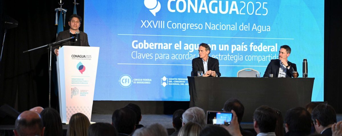 agosto 9, 2025El gobernador de la provincia de Buenos Aires, Axel Kicillof, encabezó este viernes el cierre del XXVIII Congreso Nacional del Agua (CONAGUA), un encuentro federal que busca promover la articulación entre la gestión pública y la academia para el diseño de políticas hídricas eficientes y sostenibles. Fue en el Hotel Provincial de Mar del Plata, con la presencia del ministro de Infraestructura y Servicios Públicos, Gabriel Katopodis; y el secretario general del CFI, Ignacio Lamothe.